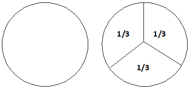 Suppose mother baked a cake, and she made three equal parts of it and gave 1 part each to my father and me, keeping one for herself. My share is one part out of three.