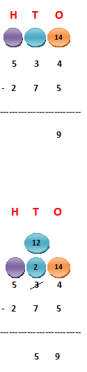 4 Ones 3 Tens 5 Hundreds, so add/place 1 before 4 ‘Ones’ , now the number stands 14 and then subtract 5 Ones from 14 Ones.