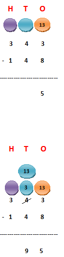 There are not enough ‘Ones’, so, Re-group 3 Ones 4 Tens 3 Hundreds, so add/place 1 before 3 ‘Ones’ , now the number stands 13 and then subtract 8 Ones from 13 Ones.