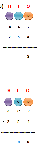 Step 2.– In Step 1. We have placed/added 1 before 2 ‘Ones’ and Now, to balance subtract 1 from 6 ‘Tens’ and then the number stands at 5 ‘Tens’. Now, subtract 5 Tens from 5 Tens,