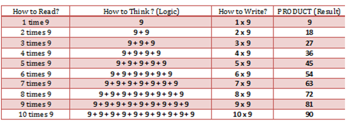 1 time 9 is = 1 x 9 = 9 (Nine)