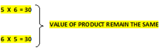 5) IN A MULTIPLICATION, POSITION OF MULTIPLICAND & MULTIPLIER WHATEVER IT MAY BE PRODUCT REMAIN THE SAME OR THE ORDERS OF NUMBERS BEING MULTIPLIED DOES NOT CHANGE THE VALUE OF PRODUCT