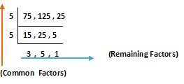 So, the HCF is 5 x 5 = 25, HCF of 75, 125 & 25 is 25.