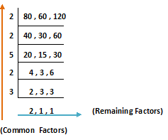 So, the HCF is 2 x 2 x 5 x 2 x 3 = 120, HCF of 80, 60 & 120 is 120.