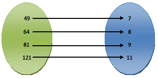 We can write f(49) = 7, similarly f(64) = 8, f(81) = 9, and f(121) = 11. In other words the images of 49, 64, 81 & 121 are 7, 8, 9, & 11 respectively. We can represent f in the roster form as –
