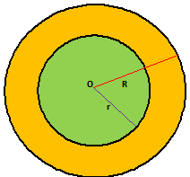 Example.1) The area enclosed by the circumference of two concentric circles is 346.5 cm². If the circumference of the inner circle is 132 cm, calculate the radius of the outer circle.