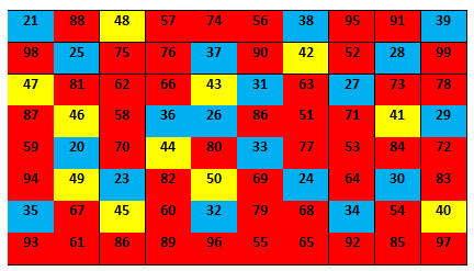 If a box shows a number a number less than 40, colour the box blue and the number above 50 then colour red and rest box colour yellow. -