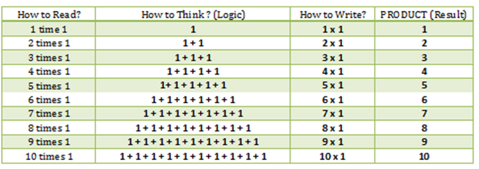 In above picture logic has been shown that 1 repeatedly has been added, and multiplication or Table of 1 showing that number 1 how many times has been shown and added that reflex into - how many times taken 1 X multiplication of number.