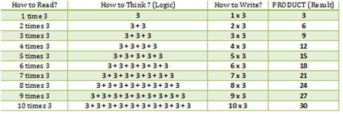 In above picture logic has been shown that 3 repeatedly has been added, and multiplication or Table of 3 showing that number 3 how many times has been shown and added that reflex into - how many times taken 3 X multiplication of number.