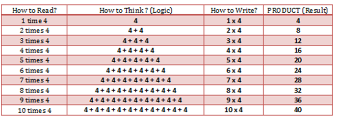 In above picture logic has been shown that 4 repeatedly has been added, and multiplication or Table of 4 showing that number 4 how many times has been shown and added that reflex into - how many times taken 4 X multiplication of number.