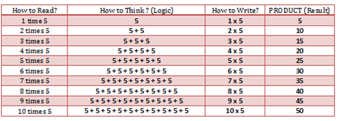 Multiplication is a concept of repeated addition, here exact logic has been given below with colour picture presentation. Here Table-1 to Table-5 has been described below -