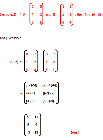 If A and B are two matrices of the same order, then their difference (A – B) is the matrix obtained by subtracting the elements of B from the corresponding elements of A.