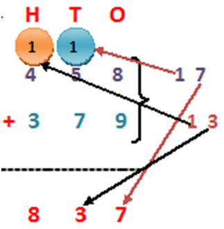 1 Tens (Carried over) + 5 Tens + 7 Tens = 13 ‘Tens’