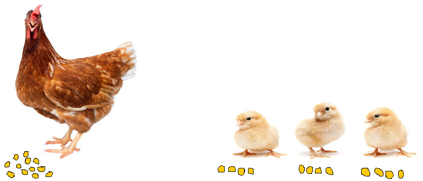 We have to divide the total number of grains, that is 12, by the number of chicks, which is 3. We can see that each chick gets 4 grains.
