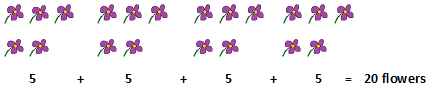 In above picture there are sets of 5 flowers and repeatedly added 4 times, so 5 flowers X 4 times added = 20 flowers. (Ans.)