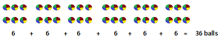 In above picture there are sets of 6 balls and repeatedly added 6 times, so 6 balls X 6 times added = 36 balls. (Ans.)