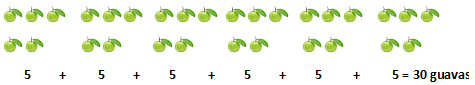 In above picture there are sets of 5 guavas and repeatedly added 6 times, so 5 guavas X 6 times added = 30 guavas. (Ans.)