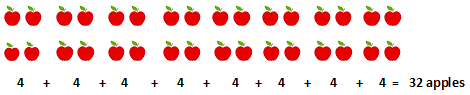 In above picture there are sets of 4 apples and repeatedly added 8 times, so 4 apples X 8 times added = 32 apples. (Ans.)
