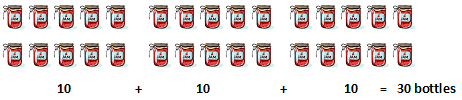 In above picture there are sets of 10 bottles of jam and repeatedly added 3 times, so 10 bottles of jam X 3 times added = 30 bottles of jam. (Ans.)