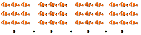 From above picture we can create the equation, such as 9 fishes multiply 4 times which is to be called multiply 4 by 9.