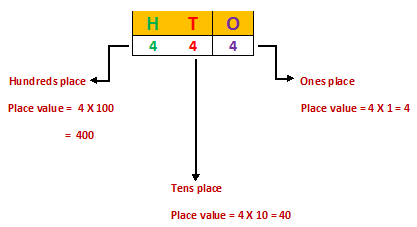 When you look at the number 444, then you will find the digit 4 is the same in all the places, Does each digit have same place value? Absolutely not. Numbers such as 444, have 3 digits, each digit has definite place value. The extreme right digit is at the ones place, the second digit from the right is at the tens place, and digit at the extreme left is at the hundreds place