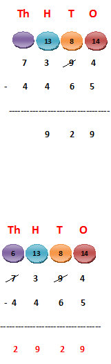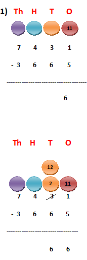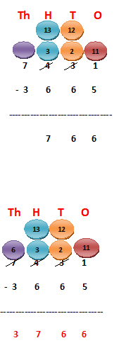 Step 4. – In Step 3. We have placed/added 1 before 3 ‘Hundreds’ and now to balance subtract 1 from 7 ‘Thousands’ and the number stands at 6 ‘Thousands’. Now, subtract 3 ‘Thousands’ from 6 ‘Thousands’.