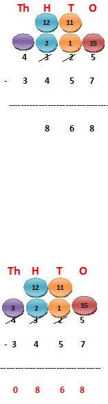 Step 4. – In Step 3. We have placed/added 1 before 2 ‘Hundreds’ and now to balance subtract 1 from 4 ‘Thousands’ and the number stands at 3 ‘Thousands’. Now, subtract 3 ‘Thousands’ from 3 ‘Thousands’.