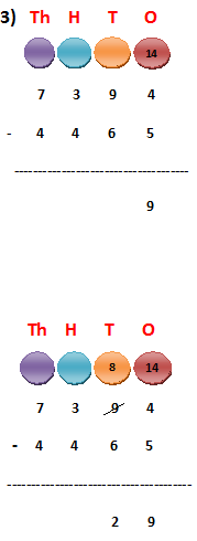 Step 1. – Subtract the ‘Ones’ But, 4 ‘Ones’ < 5 ‘Ones’ There are not enough ‘Ones’, so, Re-group 4 One 9 Tens 4 Hundreds 7 Thousand, so add/place 1 before 4 ‘Ones’ , now the number stands 14 and then subtract 5 Ones from 14 Ones.