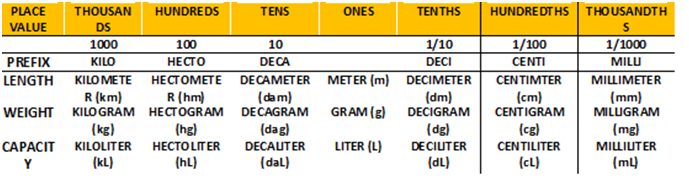 OR 0.0001 HECTO (GRAM/LITER/METER) 1 CENTI (GRAM/LITER/METER) = 1/1,00,000 KILO (GRAM/LITER/METER)