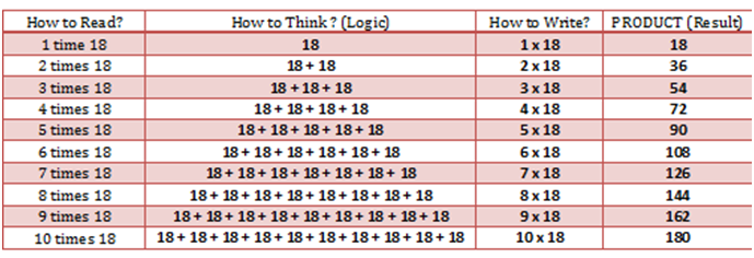 1 time 18 is = 1 x 18 = 18 (Eighteen)