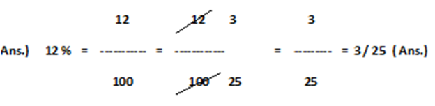 STEP-1) In above conversion we have convert the percentage to fraction first. In this fraction in Denominator we have put the two zero '0' after one '1'. So, 12 will be in Numerator and 100 will be in Denominator.