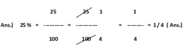 STEP-1) In above conversion we have convert the percentage to fraction first. In this fraction in Denominator we have put the two zero '0' after one '1'. So, 25 will be in Numerator and 100 will be in Denominator.