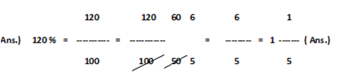 STEP-1) In above conversion we have convert the percentage to fraction first. In this fraction in Denominator we have put the two zero '0' after one '1'. So, 120 will be in Numerator and 100 will be in Denominator.