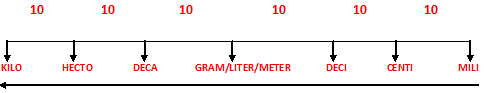 For example, if we wish to convert ‘Kilogram (Kg)’ to ‘Gram(g)’ then, count how many steps you need to jump from ‘Gram’ to ‘Kilogram’. Now you will find there are three steps, Gram - Decagram - Hectogram - Kilogram. So, 1 Kilogram should be; 1 Kilogram (Kg) = 10 x 10 x 10 Gram = 1000 Gram (g) (multiplication of three 10 for three measurement Unit)