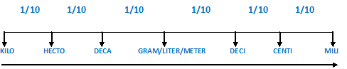For example, if we wish to convert ‘Gram(g)’ to ‘Kilogram(kg)’ then, count how many steps you need to jump from ‘Kilogram’ to ‘Gram’. Now you will find there are three steps, Kilogram - Hectogram - Decagram - Gram. So, 1 Kilogram should be ; 1 Gram (g) = 1/10 x 1/10 x 1/10 Kilogram = 1/1000 Kilogram (kg) (multiplication of three 1/10 for three measurement Unit)