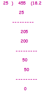 Step.2) Now divide the new Dividend 455 by the whole number 25 as Divisor. Now remember the table of 25 and put 1 in the quotient and put under the Dividend and put 20 as a reminder, now we take 5 from Dividend and place after reminder 20 and consider 205 as the new Dividend and again we will recall the table of 25 and we get 5 as reminder and place 8 at Quotient after 1. Now we will try to divide 5 by divisor 25, but it is not possible because Dividend is one-digit number and Divisor is two-digit number. So now we will place a decimal point at Quotient after 18 and at the same time place 0 (Zero) after reminder 5 and consider 50 as dividend and again we will recall the table of 25 and the Process will continue until the reminder is 0 (Zero).