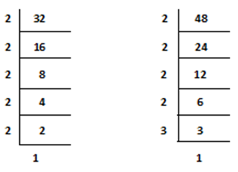From the above factorization 2 appears in 32 five times and in 48, 2 appears four times. And also 3 appears once in a factorization of 48