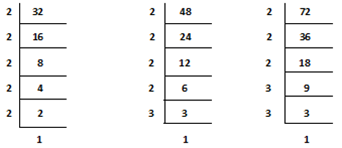 So, the Least common factor (L.C.M) of the given numbers 32, 48 and 72 are = 2 x 2 x 2 x 2 x 2 x 3 x 3 = 288 (Ans.)