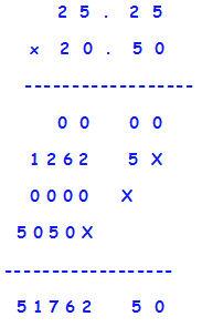 Step.4) In the given decimal number has two decimal places, so the product of given two numbers will have 2 + 2 = 4 decimal places So, the result of that given multiplication is