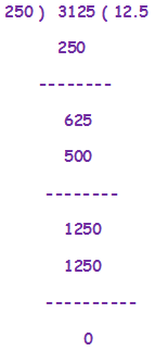 Step.1 – In this step, we can see that divisor and dividend is unlike decimal number, so we have to convert them in natural number via multiplication of 100 to both dividend & divisor and we get 2.5 X 100 = 250 and 31.25 X 100 = 3125 or in another way, we can shift decimal point as per based on the highest decimal position between two given decimal number the highest decimal places is one so we have to move two right position ahead of divisor and dividend to find the natural number.