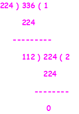 Ans.) We take the smallest number between given numbers 224 & 336 as Divisor and another would be considered as Dividend. So, 224 is Divisor and 336 is Dividend to be considered –
