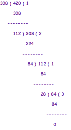 So, the HCF of two given numbers 308 & 420 would be 28 (Ans.)