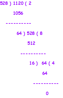 Step.1– We divide 1120 by 528 and we find 64 as a reminder.