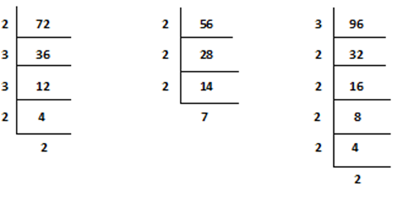 72 = 2 X 3 X 3 X 2 X 2 ; 56 = 2 X 2 X 2 X 7 ;