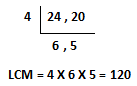 120 ÷ 24 = 5 and 120 ÷ 20 = 6; here 5 & 6 are the quotient respectively