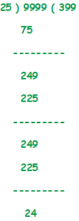 Here we can find that, 25 is divisor, 9999 is Dividend, 399 is Quotient, and 24 is remainder.