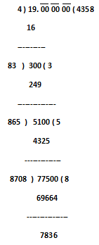 Now, after placement decimal point the obtained quotient would be 4.358 and correct to two decimal places the required number would be = 4.36
