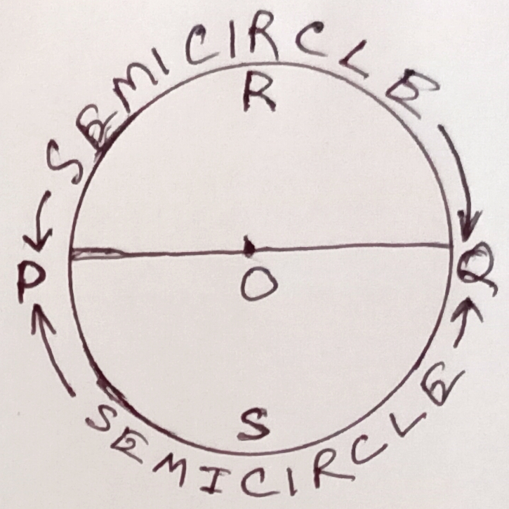 A semicircle is half a circle formed when a circle is cut along a diameter. In the figure, arcs PRQ and PSQ are two semicircles.