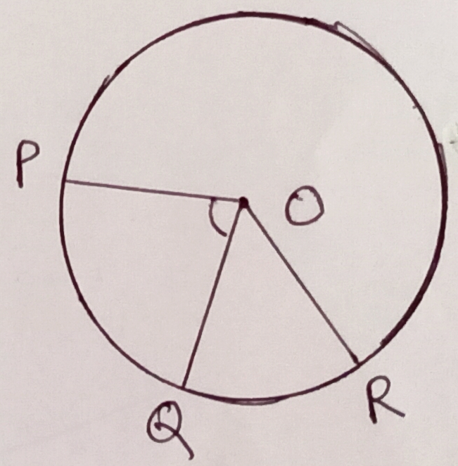 The angle subtended by any arc of a circle at the centre of the circle will be called or considered as a central angle on the arc. In the figure, ∠POQ, ∠QOR, and ∠POR are all central angles.