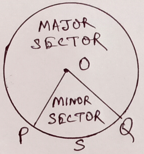 In the figure, OP and OQ are considered to be two radii. They cut off the minor arc PSQ and the major arc PRQ. The region bounded by OP, OQ, and PSQ is a minor sector. The region bounded by OP, OQ, and PRQ is a major sector.